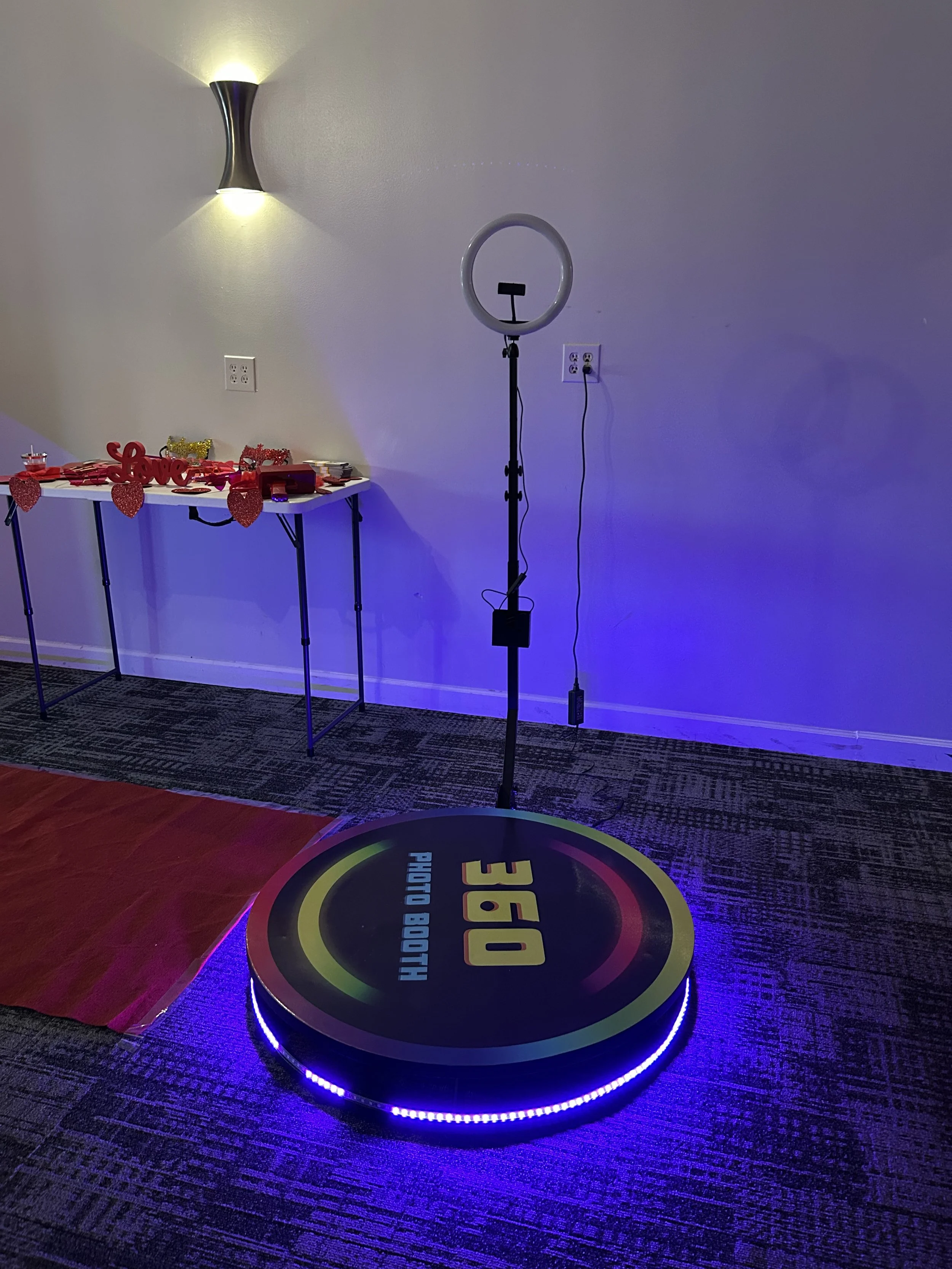 The 360 photo booth is a type of photo booth that captures a 360-degree video of the person or group standing on the podium. This device has a red carpet and special props, including a toy gun that shoots money, masks, and more. This device is operated by a remote control that can adjust the speed and direction of the photo booth.